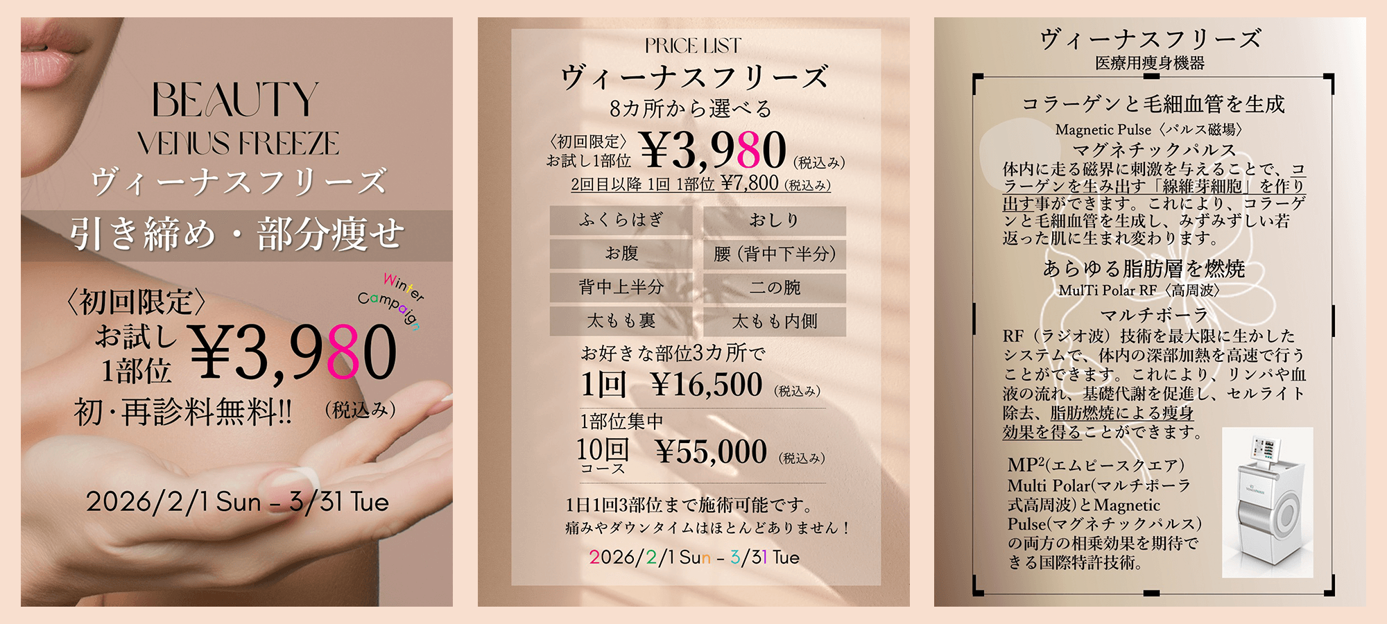 毛質や肌質に合わせて、施術が出来る医療脱毛機を複数台準備しています。1回の来院で、全身の照射が1時間30分〜2時間で可能です。